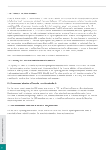22D. Credit risk on financial assetsFinancial assets subject to concentrations of credit risk and failures by counterparties to discharge their obligations in full or in a timely manner arise principally from cash balances with banks, receivables and other financial assets. The general approach in the financial reporting standard on financial instruments is applied to measure expected credit loss (ECL) allowance on financial assets. On initial recognition, a day-1 loss is recorded equal to the 12 month ECL unless the assets are considered credit impaired. The ECL allowance for debt assets is recognised at an amount equal to the lifetime ECL if the credit risk on that financial instrument has increased significantly since initial recognition. However, for trade receivables that do not contain a material financing component or when the reporting entity applies the practical expedient of not adjusting the effect of a material financing component, the simplified approach in calculating ECL is applied. Under the simplified approach, the loss allowance is recognised at an amount equal to lifetime ECL at each reporting date using historical loss rates for the respective risk categories and incorporating forward-looking estimates. Lifetime ECL may be estimated individually or collectively. For the credit risk on the financial assets an ongoing credit evaluation is performed on the financial condition of the debtors and any loss is recognised in profit or loss. Reviews and assessments of credit exposures in excess of designated limits are made. Renewals and reviews of credits limits are subject to the same review process.Note 15 discloses the cash balances. There was no identified impairment loss.22E. Liquidity risk %u2013 financial liabilities maturity analysisThe liquidity risk refers to the difficulty in meeting obligations associated with financial liabilities that are settled by delivering cash or another financial asset. It is expected that all the financial liabilities will be settled at their contractual maturity within 12 months after the end of the reporting year. The average credit period taken to settle trade payables is about 30 to 60 days (2023: 30 to 60 days). The other payables are with short-term durations. The classification of the financial assets is shown in the statement of financial position as they may be available to meet liquidity needs and no further analysis is deemed necessary.23. Changes and adoption of financial reporting standardsFor the current reporting year the ASC issued amendment to FRS 1 and Practice Statement 2 on disclosures of material accounting policy and other explanatory information. Immaterial information need not be disclosed. Disclosures should not obscure material accounting policy information (such as material information being obscured, or information regarding a material item, transaction or other event is scattered throughout the financial statements, etc). In addition, the ASC issued certain new or revised financial reporting standards. None had material impact on the association.24. New or amended standards in issue but not yet effectiveFor the future reporting years the ASC issued certain new or revised financial reporting standards. None is expected to have material impact on the association based on its current operations.10025TH ANNUAL REPORT | 2023 - 2024