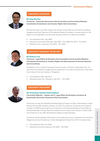 Governance ReportMr Ang Hao YaoChairman %u2013 Corporate Governance Sub Committee and Committee Member - Constitution Amendment and Investor Rights Sub CommitteesHONORARY SECRETARY Mr Ang Hao Yao is a private investor and serves as the Chairman of Credit Counselling Singapore and Vice Chairman of The National Kidney Foundation. He also serves on the Board of the SingHealth Fund and was the past Chairman of Sata CommHealth.%u2022 First elected to MC: Sep 2003%u2022 Elected as Committee Member: Sep 2003 %u2013 Oct 2009; Oct 2015 %u2013 Oct 2019; %u2022 Elected as Hon. Secretary: Oct 2019 %u2013 Oct 2025Mr Robson Lee Chairman - Legal Affairs & Discipline Sub Committee and Committee Member %u2013 Constitution Amendment, Investor Rights and Remuneration & Human Resource Sub CommitteesASSISTANT HONORARY SECRETARY Mr Robson Lee is a Senior Corporate Finance Lawyer, a Partner of Kennedys Law. He has more than 30 years of legal practice experience. He is also the Chairman of the Audit Committee of the Law Society of Singapore.%u2022 First elected to MC: Sep 2011 %u2022 Elected as Asst Hon. Secretary: Sep 2011 %u2013 Oct 2025Mr Srinivasan Venkita PadmanabhanCommittee Member %u2013 Digital and IT, Legal Affairs & Discipline and Green & Sustainable Securities Investment Sub CommitteesHONORARY TREASURERPreviously, he was the President & Global Head of Finance of Olam International Limited (Group) fortune 500 company, Director of SICCI, Co Chairman of Finance committee & member of MDIS Governing Council, Chairman of the External Relations Committee of SIFAS & Member of Audit, Risk & Compliance Committee of SID, Mentor in YBLN, SBF, Vice Chairman of the IAEC & Grassroots leader for about 20 years.He has won Asia%u2019s greatest CFO award, two consecutive times, awarded by the Asia One Magazine and won Excellence in Crisis Management Award from CFO Innovation Asia.%u2022 First elected to MC: Oct 2023%u2022 Elected as Honorary Treasurer: Oct 2023 %u2013 Oct 202511 25TH ANNUAL REPORT | 2023 - 2024