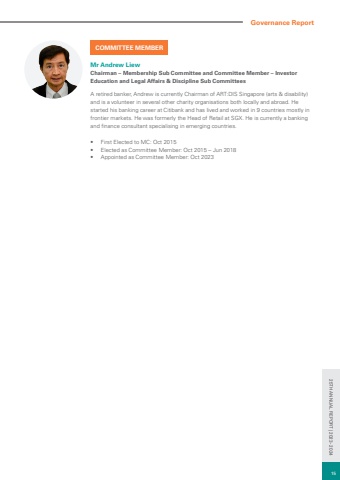Mr Andrew LiewChairman %u2013 Membership Sub Committee and Committee Member %u2013 Investor Education and Legal Affairs & Discipline Sub CommitteesCOMMITTEE MEMBER A retired banker, Andrew is currently Chairman of ART:DIS Singapore (arts & disability) and is a volunteer in several other charity organisations both locally and abroad. He started his banking career at Citibank and has lived and worked in 9 countries mostly in frontier markets. He was formerly the Head of Retail at SGX. He is currently a banking and finance consultant specialising in emerging countries.%u2022 First Elected to MC: Oct 2015%u2022 Elected as Committee Member: Oct 2015 %u2013 Jun 2018%u2022 Appointed as Committee Member: Oct 2023Governance Report15 25TH ANNUAL REPORT | 2023 - 2024