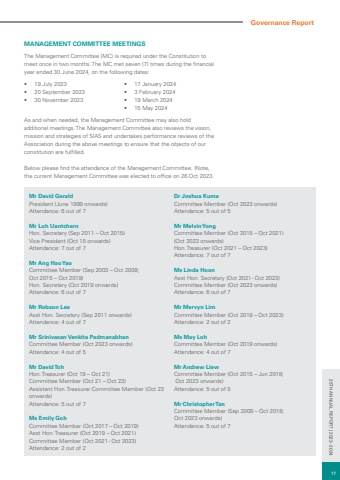 Governance ReportMANAGEMENT COMMITTEE MEETINGSThe Management Committee (MC) is required under the Constitution to meet once in two months. The MC met seven (7) times during the financial year ended 30 June 2024, on the following dates: %u2022 19 July 2023 %u2022 20 September 2023 %u2022 30 November 2023 %u2022 17 January 2024 %u2022 3 February 2024 %u2022 19 March 2024 %u2022 15 May 2024As and when needed, the Management Committee may also hold additional meetings. The Management Committee also reviews the vision, mission and strategies of SIAS and undertakes performance reviews of the Association during the above meetings to ensure that the objects of our constitution are fulfilled.Below please find the attendance of the Management Committee. (Note, the current Management Committee was elected to office on 26 Oct 2023. Mr David Gerald President (June 1999 onwards) Attendance: 6 out of 7 Mr Loh Uantchern Hon. Secretary (Sep 2011 %u2013 Oct 2015) Vice President (Oct 15 onwards) Attendance: 7 out of 7Mr Ang Hao Yao Committee Member (Sep 2003 %u2013 Oct 2009;Oct 2015 %u2013 Oct 2019) Hon. Secretary (Oct 2019 onwards) Attendance: 6 out of 7 Mr Robson LeeAsst Hon. Secretary (Sep 2011 onwards)Attendance: 4 out of 7 Mr Srinivasan Venkita PadmanabhanCommittee Member (Oct 2023 onwards)Attendance: 4 out of 5Mr David Toh Hon. Treasurer (Oct 19 %u2013 Oct 21) Committee Member (Oct 21 %u2013 Oct 23) Assistant Hon. Treasurer Committee Member (Oct 23 onwards)Attendance: 5 out of 7Ms Emily Goh Committee Member (Oct 2017 %u2013 Oct 2019) Asst Hon. Treasurer (Oct 2019 %u2013 Oct 2021) Committee Member (Oct 2021 - Oct 2023) Attendance: 2 out of 2Dr Joshua KumaCommittee Member (Oct 2023 onwards)Attendance: 5 out of 5Mr Melvin Yong Committee Member (Oct 2015 %u2013 Oct 2021) (Oct 2023 onwards)Hon. Treasurer (Oct 2021 %u2013 Oct 2023) Attendance: 7 out of 7Ms Linda Hoon Asst Hon. Secretary (Oct 2021 - Oct 2023)Committee Member (Oct 2023 onwards)Attendance: 6 out of 7 Mr Mervyn Lim Committee Member (Oct 2019 %u2013 Oct 2023) Attendance: 2 out of 2 Ms May Loh Committee Member (Oct 2019 onwards) Attendance: 4 out of 7Mr Andrew LiewCommittee Member (Oct 2015 %u2013 Jun 2018; Oct 2023 onwards)Attendance: 5 out of 5Mr Christopher TanCommittee Member (Sep 2009 %u2013 Oct 2018; Oct 2023 onwards)Attendance: 5 out of 717 25TH ANNUAL REPORT | 2023 - 2024