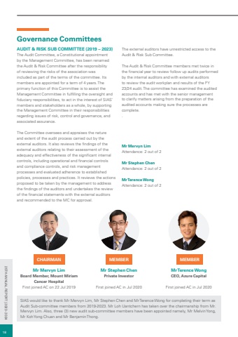 Governance CommitteesAUDIT & RISK SUB COMMITTEE (2019 %u2013 2023)The Audit Committee, a Constitutional appointment by the Management Committee, has been renamed the Audit & Risk Committee after the responsibility of reviewing the risks of the association was included as part of the terms of the committee. Its members are appointed for a term of 4 years. The primary function of this Committee is to assist the Management Committee in fulfilling the oversight and fiduciary responsibilities, to act in the interest of SIAS%u2019 members and stakeholders as a whole, by supporting the Management Committee in their responsibilities regarding issues of risk, control and governance, and associated assurance. The Committee oversees and appraises the nature and extent of the audit process carried out by the external auditors. It also reviews the findings of the external auditors relating to their assessment of the adequacy and effectiveness of the significant internal controls, including operational and financial controls and compliance controls, and risk management processes and evaluated adherence to established policies, processes and practices. It reviews the actions proposed to be taken by the management to address the findings of the auditors and undertakes the review of the financial statements with the external auditors and recommended to the MC for approval.The external auditors have unrestricted access to the Audit & Risk Sub Committee.The Audit & Risk Committee members met twice in the financial year to review follow up audits performed by the internal auditors and with external auditors to review the audit workplan and results of the FY 23/24 audit. The committee has examined the audited accounts and has met with the senior management to clarify matters arising from the preparation of the audited accounts making sure the processes are complete..Mr Mervyn Lim Board Member, Mount Miriam Cancer HospitalFirst joined AC on 22 Jul 2019CHAIRMAN Mr Terence Wong CEO, Azure Capital First joined AC in Jul 2020MEMBER Mr Stephen ChenPrivate InvestorFirst joined AC in Jul 2020MEMBERMr Mervyn Lim Attendance: 2 out of 2Mr Stephen Chen Attendance: 2 out of 2 Mr Terence Wong Attendance: 2 out of 2SIAS would like to thank Mr Mervyn Lim, Mr Stephen Chen and Mr Terence Wong for completing their term as Audit Sub-committee members from 2019-2023. Mr Loh Uantchern has taken over the chairmanship from Mr. Mervyn Lim. Also, three (3) new audit sub-committee members have been appointed namely, Mr Melvin Yong, Mr Koh Yong Chuan and Mr Benjamin Thong.1825TH ANNUAL REPORT | 2023 - 2024