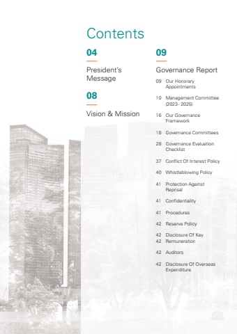 Contents04President%u2019s Message08Vision & Mission09Governance ReportOur Honorary Appointments Management Committee (2023 - 2025) Our Governance Framework Governance CommitteesGovernance Evaluation ChecklistConflict Of Interest PolicyWhistleblowing PolicyProtection Against ReprisalConfidentialityProceduresReserve PolicyDisclosure Of Key RemunerationAuditorsDisclosure Of OverseasExpenditure091016182837404141414242424242