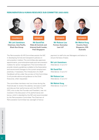 REMUNERATION & HUMAN RESOURCE SUB COMMITTEE (2023-2025)Mr Loh Uantchern Chairman, Asia Pacific, Black Sun GroupCHAIRMAN The Remuneration & HR Committee assists the MC in developing formal and transparent policies on remuneration matters. The committee also approves appointments, promotions/removals and remuneration matters for senior management. This Committee will provide industry guidelines suitable to the Association and recommend changes to the current employment practices, if necessary. The introduction of a Staff Handbook will be under the purview of this Committee. It will provide advice and guidance to the Chief Executive, when requested.The committee members met two times during the financial year to review the salaries, bonuses to staff and discuss their performance with the CEO. The CEO, who is also the Founder and President, was not involved in the discussion of his performance and bonus, which is decided by the MC and recommended by the Remuneration Committee. The Chairman of Remuneration Committee has oversight of bonus Mr David Toh Risks & Controls and Internal Audit Leader, PwC SingaporeMEMBERMr Robson Lee Partner, KennedysLaw LLPMEMBERMr Melvin YongCountry Head, Singapore, CPA AustraliaMEMBERpayment to staff who are Managers and below to ensure fairness of basis. Mr Loh Uantchern Attendance: 2 out of 2Mr David Toh Attendance: 2 out of 2 Mr Robson Lee Attendance: 2 out of 2Mr Melvin Yong Attendance: 2 out of 22025TH ANNUAL REPORT | 2023 - 2024