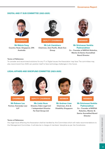Governance ReportDIGITAL AND IT SUB COMMITTEE (2023-2025)Mr Melvin Yong Country Head, Singapore, CPA AustraliaCHAIRMAN Mr Loh UantchernChairman, Asia Pacific, Black Sun GroupDEPUTY CHAIRMAN Mr Srinivasan Venkita PadmanabhanCo %u2013 Founder of WEFAA Robotics, Mentor & Senior Accredited Board DirectorMEMBERTerms of Reference To consider and recommend solutions for any IT or Digital issues the Association may face. The committee may also recommend how SIAS can position itself to face technology challenges in the future.LEGAL AFFAIRS AND DISCIPLINE COMMITTEE (2023-2025)Mr Robson Lee Partner, Kennedys Law LLPCHAIRMAN Ms Linda Hoon Director, Oaks Legal LLC / Independent Director Far East Group LtdDEPUTY CHAIRMAN Mr Andrew LiewChairman, Arts & Disability SingaporeMEMBERTerms of Reference Any legal issue affecting the Association shall be handled by this Committee which will make recommendations to the Management Committee. It will also be in charge of members%u2019 discipline as per the Constitution.Mr Srinivasan Venkita PadmanabhanCo %u2013 Founder of WEFAA Robotics, Mentor & Senior Accredited Board DirectorMEMBER25 25TH ANNUAL REPORT | 2023 - 2024