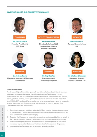 INVESTOR RIGHTS SUB COMMITTEE (2023-2025)Mr Robson Lee Partner, Kennedys Law LLPDEPUTY CHAIRPERSON Terms of Reference The Investor Rights Committee generally identifies efforts and activities to observe, safeguard, improve and advance the rights and claims of an investor, in their investments. This will include identifying gaps and market inefficiencies (e.g. trading issues, glitches, scams), review product structures to enhance investor protection (e.g. SPACs, SIPs and bond frameworks) and advance shareholder rights (in corporate actions, liquidation etc). This committee will comprise of industry leaders. This Committee%u2019s focus will also include: 1. To review the current positions taken by SIAS on investor rights and recommend to Management Committee any proposed changes and where a position had not been taken to advise SIAS accordingly;2. To assist the President to ensure the press statements issued by him on behalf of SIAS are aligned with the Association%u2019s stand on various investor rights%u2019 issues;3. To monitor company activities and develop SIAS position papers as and when necessary to protect and advance the interests of all investors in Singapore; 4. Improve quality of engagement at company general meetingsMr David GeraldFounder, President & CEO, SIASCHAIRMANMs Linda Hoon Director, Oaks Legal LLC /Independent Director Far East Group LtdMEMBERDr Joshua KumaManaging Director, EQT Partners Asia Pte LtdMEMBERMr Ang Hao YaoChairman, Credit Counselling SingaporeMEMBERMs Shobna Chandran Managing Director, Shobna Chandran LLCMEMBER2625TH ANNUAL REPORT | 2023 - 2024