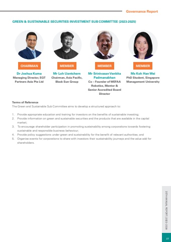 Governance ReportGREEN & SUSTAINABLE SECURITIES INVESTMENT SUB COMMITTEE (2023-2025)Dr Joshua KumaManaging Director, EQT Partners Asia Pte LtdCHAIRMAN Mr Loh Uantchern Chairman, Asia Pacific, Black Sun GroupMEMBERMr Srinivasan Venkita PadmanabhanCo %u2013 Founder of WEFAA Robotics, Mentor & Senior Accredited Board DirectorMEMBERTerms of Reference The Green and Sustainable Sub Committee aims to develop a structured approach to:1. Provide appropriate education and training for investors on the benefits of sustainable investing;2. Provide information on green and sustainable securities and the products that are available in the capital market;3. To encourage shareholder participation in promoting sustainability among corporations towards fostering sustainable and responsible business behaviour;4. Provide policy suggestions under green and sustainability for the benefit of relevant authorities; and5. Organise events for corporations to share with investors their sustainability journeys and the value add for shareholders.Ms Koh Han WeiPhD Student, Singapore Management UniversityMEMBER27 25TH ANNUAL REPORT | 2023 - 2024