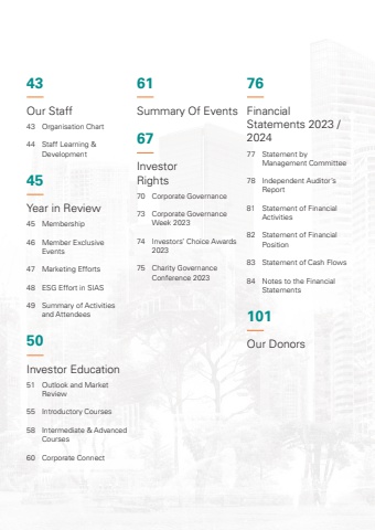 43Our StaffOrganisation Chart Staff Learning & Development434476Financial Statements 2023 / 2024101Our Donors45Year in ReviewMembershipMember Exclusive EventsMarketing EffortsESG Effort in SIASSummary of Activities and Attendees454647484950Investor EducationOutlook and Market ReviewIntroductory CoursesIntermediate & Advanced CoursesCorporate Connect5155586061Summary Of Events67InvestorRightsCorporate GovernanceCorporate Governance Week 2023Investors%u2019 Choice Awards 2023Charity Governance Conference 202370737475Statement by Management CommitteeIndependent Auditor%u2019s ReportStatement of Financial ActivitiesStatement of Financial PositionStatement of Cash FlowsNotes to the Financial Statements777881828384