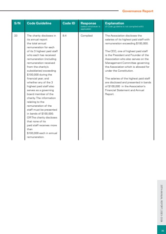 Governance ReportS/N Code Guideline Code ID Response(select whichever is applicable)Explanation(if Code guideline is not complied with)33 The charity discloses in its annual report:the total annual remuneration for each of its 3 highest paid staff who each has received remuneration (includingremuneration received from the charity%u2019s subsidiaries) exceeding $100,000 during the financial year; andwhether any of the 3 highest paid staff also serves as a governing board member of the charity. The information relating to the remuneration of the staff must be presented in bands of $100,000. OR The charity discloses that none of itspaid staff receives more than$100,000 each in annual remuneration.8.4 Complied The Association discloses the salaries of its highest paid staff with remuneration exceeding $100,000. The CEO, one of highest paid staff is the President and Founder of the Association who also serves on the Management Committee governing the Association which is allowed for under the Constitution. The salaries of the highest paid staff are disclosed and presented in bands of $100,000 in the Association%u2019s Financial Statement and Annual Report. 35 25TH ANNUAL REPORT | 2023 - 2024