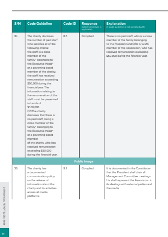 S/N Code Guideline Code ID Response(select whichever is applicable)Explanation(if Code guideline is not complied with)34 The charity discloses the number of paid staff who satisfies all of the following criteria:the staff is a close member of the family* belonging to the Executive Head* or a governing board member of the charity;the staff has received remuneration exceeding$50,000 during the financial year. The information relating to the remuneration of the staff must be presented in bands of$100,000.OR The charity discloses that there is no paid staff, being a close member of the family* belonging to the Executive Head* or a governing board memberof the charity, who has received remuneration exceeding $50,000 during the financial year.8.5 Complied There is no paid staff, who is a close member of the family belonging to the President and CEO or a MC member of the Association, who has received remuneration exceeding $50,000 during the financial year.Public Image35 The charity has a documented communication policy on the release of information about the charity and its activities across all media platforms.9.2 Complied It is documented in the Constitution that the President shall chair all Management Committee meetings. He shall represent the Association in its dealings with external parties and the media.3625TH ANNUAL REPORT | 2023 - 2024