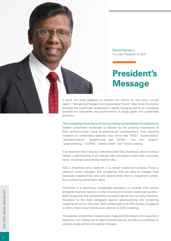 President%u2019s MessageIt gives me great pleasure to present the theme for this year%u2019s annual report, %u201cNavigating Changes for a Sustainable Future%u2019%u2019. We chose this theme because the investment landscape is rapidly changing due to an increasing demand for companies and governments to adopt green and sustainable practices.The increasing importance of incorporating sustainability in investmentsToday%u2019s investment landscape is marked by the growing importance of ESG (environmental, social & governance) considerations, thus requiring investors to understand relatively new terms like %u201cESG,%u201d %u201csustainability,%u201d %u201cdecarbonisation,%u201d %u201cgreenhouse gas (GHG),%u201d %u201cnet zero targets,%u201d %u201cgreenwashing,%u201d %u201cCOP28,%u201d %u201ccarbon credit,%u201d and %u201ccarbon trading%u201d.It is important that investors understand that ESG investing is about having a holistic understanding of all material risks and opportunities that a business faces, including sustainability-related risks. ESG is therefore not a trade-off; it is robust investment analysis. There is research which indicates that companies that are able to manage their financially material ESG risks and opportunities tend to outperform others, thus enhancing shareholder value.Therefore, it is becoming increasingly necessary to consider ESG factors alongside financial metrics in order to arrive at a holistic investment profile.SIAS recognizes that sustainability concepts may be new to many investors. Education is the best safeguard against greenwashing and protecting investments and to this end, SIAS collaborated with CFA Society Singapore to offer a free 2-hour introduction webinar on ESG Investing. The webinar shared how investors can integrate ESG factors into investment decisions, not merely just to seek financial returns, but also to contribute to positive social and environmental changes.David Gerald J.Founder, President & CEO425TH ANNUAL REPORT | 2023 - 2024