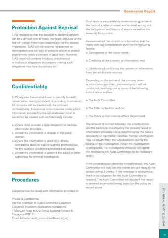 Protection Against ReprisalSIAS recognises that the decision to report a concern can be a difficult one to make, not least, because of the fear of reprisal from those responsible for the alleged malpractice. SIAS will not tolerate harassment or victimisation and will take all possible action to protect anyone who raises a concern in good faith. However, SIAS does not condone frivolous, mischievous or malicious allegations and anyone making such allegations may face disciplinary act. ConfidentialitySIAS requires the whistleblower to identify himself/herself when raising a concern or providing information. All concerns will be treated with the strictest confidentiality. Exceptional circumstances under which information provided by the whistleblower could or would not be treated with confidentiality include: a. Where SIAS is under a legal obligation to disclose information provided. b. Where the information is already in the public domain. c. Where the information is given on a strictly confidential basis to legal or auditing professionals for the purpose of obtaining professional advice. d. Where the information is given to the police or other authorities for criminal investigation.ProceduresConcerns may be raised with information provided to: Private & Confidential For the Attention of Audit Committee Chairman Securities Investors Association (Singapore) 7 Maxwell Road #05-03 MND Building Annexe B Singapore 069111 Email Address: audit_committee@sias.org.sg Such reports are preferably made in writing, either in the form of a letter or email, and in detail setting out the background and history of events as well as the reason(s) for concern. Assessment of the concern or information shall be made with due consideration given to the following factors:a. Seriousness of the issue raised; b. Credibility of the concern or information; and c. Likelihood of confirming the concern or information from the attributable sources Depending on the nature of the concern raised or information provided, the investigation will be conducted, involving one or more of the following individuals or entities: a. The Audit Committee b. The External Auditor, and / or c. The Police or Commercial Affairs DepartmentThe amount of contact between the whistleblower and the person(s) investigating the concern raised or information provided will be determined by the nature and clarity of the matter reported. Further information may be sought from the whistleblower during the course of the investigation. When the investigation is completed, the investigating officer(s) will report the findings to the Audit Committee for its necessary action. If the whistleblower identifies himself/herself, the Audit Committee will look into the matter and will reply to the person within 2 weeks. If the message is anonymous there is no obligation for the Audit Committee to respond. The Audit Committee will decide if the report is deemed as whistleblowing based on the policy as stated above.Governance Report41 25TH ANNUAL REPORT | 2023 - 2024