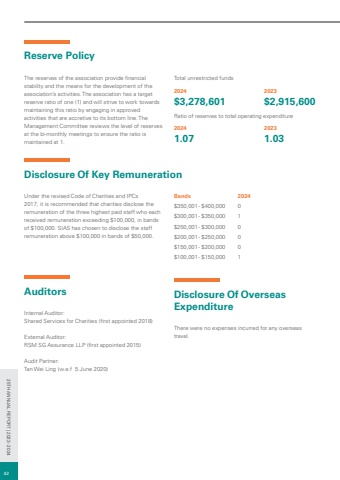 Reserve PolicyThe reserves of the association provide financial stability and the means for the development of the association%u2019s activities. The association has a target reserve ratio of one (1) and will strive to work towards maintaining this ratio by engaging in approved activities that are accretive to its bottom line. The Management Committee reviews the level of reserves at the bi-monthly meetings to ensure the ratio is maintained at 1.Total unrestricted funds$3,278,6012024$2,915,6002023Ratio of reserves to total operating expenditure1.0720241.032023Disclosure Of Key Remuneration Under the revised Code of Charities and IPCs 2017, it is recommended that charities disclose the remuneration of the three highest paid staff who each received remuneration exceeding $100,000, in bands of $100,000. SIAS has chosen to disclose the staff remuneration above $100,000 in bands of $50,000.Bands$350,001 - $400,000$300,001 - $350,000$250,001 - $300,000$200,001 - $250,000$150,001 - $200,000$100,001 - $150,0002024010001Auditors Internal Auditor: Shared Services for Charities (first appointed 2018) External Auditor:RSM SG Assurance LLP (first appointed 2015) Audit Partner: Tan Wei Ling (w.e.f 5 June 2020)Disclosure Of Overseas Expenditure There were no expenses incurred for any overseas travel.4225TH ANNUAL REPORT | 2023 - 2024