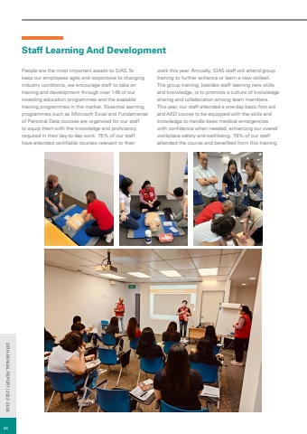 Staff Learning And DevelopmentPeople are the most important assets to SIAS. To keep our employees agile and responsive to changing industry conditions, we encourage staff to take on training and development through over 148 of our investing education programmes and the available training programmes in the market. Essential learning programmes such as Microsoft Excel and Fundamental of Personal Data courses are organised for our staff to equip them with the knowledge and proficiency required in their day-to-day work. 75% of our staff have attended certifiable courses relevant to their work this year. Annually, SIAS staff will attend group training to further enhance or learn a new skillset. The group training, besides staff learning new skills and knowledge, is to promote a culture of knowledge sharing and collaboration among team members. This year, our staff attended a one-day basic first aid and AED course to be equipped with the skills and knowledge to handle basic medical emergencies with confidence when needed, enhancing our overall workplace safety and well-being. 79% of our staff attended the course and benefited from this training.4425TH ANNUAL REPORT | 2023 - 2024