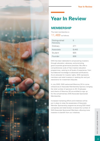 Year In ReviewYear In Review MEMBERSHIPThe total membership is 11,469 as follows:Distinguished Honorary5Ordinary 271Associate 9,442Student 925Founder 826SIAS has been dedicated to empowering investors through education, advocacy, and promoting good corporate governance practices. We offer a comprehensive suite of free investor education programmes, catering to all levels of experience, from foundational knowledge to advanced certifications. As an advocate for investor rights, SIAS represents members and retail investors in seeking fair and just resolutions for investment disputes.In July 2023, SIAS welcomed Moomoo SG to come onboard as an Associate Membership Sponsor, bringing the total number of sponsors to 25. Employees and clients of Moomoo SG are entitled to sign up for the complimentary SIAS Associate Sponsored Membership.Increased marketing efforts and initiatives will be put in place to raise the awareness of Associate Member Sponsorship programme among SGX listed companies and retail brokers to boost the number of SIAS Associate Sponsored Members, allowing more investors to benefit from our initiatives.45 25TH ANNUAL REPORT | 2023 - 2024