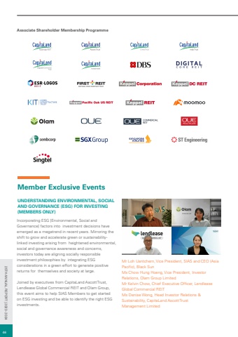 Associate Shareholder Membership ProgrammeUNDERSTANDING ENVIRONMENTAL, SOCIAL AND GOVERNANCE (ESG) FOR INVESTING (MEMBERS ONLY)Incorporating ESG [Environmental, Social and Governance] factors into investment decisions have emerged as a megatrend in recent years. Mirroring the shift to grow and accelerate green or sustainabilitylinked investing arising from heightened environmental, social and governance awareness and concerns, investors today are aligning socially responsible investment philosophies by integrating ESG considerations in a green effort to generate positive returns for themselves and society at large.Joined by executives from CapitaLand Ascott Trust, Lendlease Global Commercial REIT and Olam Group, this event aims to help SIAS Members to get started on ESG investing and be able to identify the right ESG investments.Mr Loh Uantchern, Vice President, SIAS and CEO (Asia Pacific), Black SunMs Chow Hung Hoeng, Vice President, Investor Relations, Olam Group LimitedMr Kelvin Chow, Chief Executive Officer, Lendlease Global Commercial REITMs Denise Wong, Head Investor Relations & Sustainability, CapitaLand Ascott TrustManagement LimitedMember Exclusive Events4625TH ANNUAL REPORT | 2023 - 2024