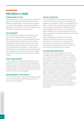 ESG Effort in SIASCOMMITMENT TO ESGSIAS is dedicated to sustainable practices, aligning with global and national goals. We%u2019ve established an ESG Roadmap, engaged staff, and implemented initiatives in environmental protection, social responsibility and governance. Our efforts aim to create a positive impact and foster a sustainable work environment. ESG ROADMAPOur ESG Roadmap is designed to positively impact and minimize negative effects through the ESG framework. To achieve this, we%u2019ve established a Green and Sustainable Sub Committee and internal SIAS ESG Taskforce. Both parties will evaluate our current ESG progress, develop strategies for enhancement, and create educational resources for retail investors. Additionally, the sub committee aims to develop policy recommendations to relevant authorities and integrate sustainability questions into SIAS%u2019 annual report Q&A process.STAFF ENGAGEMENTIn January 2024, we initiated ESG discussions at our annual staff retreat. Staff members were divided into groups to discuss sustainability practices, with a focus on the 3Rs (Reduce, Reuse, Recycle). This engagement provided a platform for staff to contribute ideas on how SIAS can continue to be sustainable.ENVIRONMENTAL INITIATIVESTo kick start the initiative, staff are encouraged to bring their own water bottles and lunch boxes to work to reduce single-use plastics.SOCIAL INITIATIVESWe are committed to fostering diversity, equity, and inclusion (DEI) within our workforce. Comprehensive guidelines are provided through our HR Handbook and Manual. Staff are encouraged to participate actively in monthly Work In Progress (WIP) meetings and halfyearly appraisals. Exit interviews are conducted to gather feedback from resigning employees. Fair and ethical treatment of employees is enshrined in the SIAS Code of Ethics.SIAS embeds ESG principles in its community programs, addressing social issues such as the prevention of investment scams and outreach to vulnerable groups. We invest in staff training and development, supported by an incentive program to encourage continuous learning and growth.GOVERNANCE INITIATIVESA skillsets matrix has been established for the management committee (MC) to ensure a diverse mix of expertise. Policies on Anti-Money Laundering (AML) and Counter Financing of Terrorism (CFT) have been developed. Volunteer management policies and procedures, including Non-Disclosure Agreements (NDA) and a code of conduct, are in place. Regular internal reviews are conducted to ensure compliance with Charity CG and FSDF restrictions. Performance metrics are reported to the CEO to track our progress.SIAS%u2019s comprehensive approach to integrating ESG principles into its operations demonstrates our commitment to fostering a sustainable and inclusive work environment. Through continuous engagement, environmental and social initiatives, and robust governance practices, we aim to contribute positively to ESG outcomes and support the broader goals of sustainability.4825TH ANNUAL REPORT | 2023 - 2024