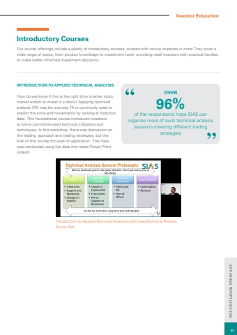 Introductory CoursesOur course offerings include a variety of introductory courses, curated with novice investors in mind. They cover a wide range of topics, from product knowledge to investment tools, providing retail investors with practical handles to make better informed investment decisions.Introduction to Applied Technical Analysis with Lead Technical Analyst, Sunny SohINTRODUCTION TO APPLIED TECHNICAL ANALYSISHow do we know if this is the right time to enter stock market and/or to invest in a stock? Applying technical analysis (TA) may be one way. TA is commonly used to predict the price and movements by looking at historical data. This foundational course introduces investors to some commonly-used technical indicators and techniques. In this workshop, there was discussion on the trading approach and trading strategies, but the bulk of this course focused on application. The class was conducted using live data (not static Power Point slides!)of the respondents hope SIAS can organise more of such technical analysis sessions covering different trading strategies96%OVERInvestor Education55 25TH ANNUAL REPORT | 2023 - 2024