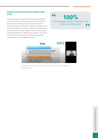 Introduction to Exchange Traded Funds (ETFs) with SIAS Speaker, Gerald WongINTRODUCTION TO EXCHANGE TRADED FUNDS (ETFS)Exchange Traded Funds (ETFs) represent a milestone in the evolution of financial products. Combining the diversification benefits of unit trust funds and the liquidity of stocks, ETFs are cost efficient products that provide exposure to whatever markets, asset classes or sectors that the investor desires. Already comprising a substantial portion of trading in US markets, the variety and size of ETFs are set to continue growing both overseas and in the Singapore market.of the attendees rated the content of the workshop to be just right100%Investor Education57 25TH ANNUAL REPORT | 2023 - 2024