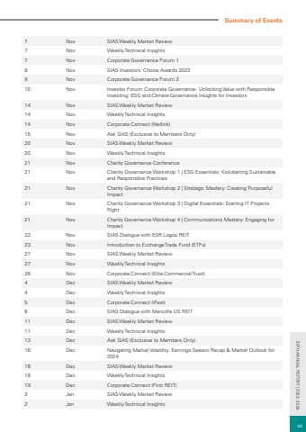 7 Nov SIAS Weekly Market Review7 Nov Weekly Technical Insights7 Nov Corporate Governance Forum 18 Nov SIAS Investors' Choice Awards 20239 Nov Corporate Governance Forum 210 Nov Investor Forum: Corporate Governance - Unlocking Value with Responsible Investing: ESG and Climate Governance Insights for Investors14 Nov SIAS Weekly Market Review14 Nov Weekly Technical Insights14 Nov Corporate Connect (Netlink)15 Nov Ask SIAS (Exclusive to Members Only)20 Nov SIAS Weekly Market Review20 Nov Weekly Technical Insights21 Nov Charity Governance Conference21 Nov Charity Governance Workshop 1 | ESG Essentials: Kickstarting Sustainable and Responsible Practices21 Nov Charity Governance Workshop 2 | Strategic Mastery: Creating Purposeful Impact21 Nov Charity Governance Workshop 3 | Digital Essentials: Starting IT Projects Right21 Nov Charity Governance Workshop 4 | Communications Mastery: Engaging for Impact22 Nov SIAS Dialogue with ESR Logos REIT23 Nov Introduction to Exchange Trade Fund (ETFs)27 Nov SIAS Weekly Market Review27 Nov Weekly Technical Insights28 Nov Corporate Connect (Elite Commercial Trust)4 Dec SIAS Weekly Market Review4 Dec Weekly Technical Insights5 Dec Corporate Connect (iFast)6 Dec SIAS Dialogue with Manulife US REIT11 Dec SIAS Weekly Market Review11 Dec Weekly Technical Insights13 Dec Ask SIAS (Exclusive to Members Only)16 Dec Navigating Market Volatility: Earnings Season Recap & Market Outlook for 202418 Dec SIAS Weekly Market Review18 Dec Weekly Technical Insights19 Dec Corporate Connect (First REIT)2 Jan SIAS Weekly Market Review2 Jan Weekly Technical InsightsSummary of Events63 25TH ANNUAL REPORT | 2023 - 2024