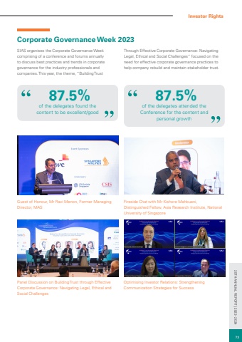 Corporate Governance Week 2023SIAS organises the Corporate Governance Week comprising of a conference and forums annually to discuss best practices and trends in corporate governance for the industry professionals and companies. This year, the theme, %u201cBuilding Trust Panel Discussion on Building Trust through EffectiveCorporate Governance: Navigating Legal, Ethical andSocial ChallengesGuest of Honour, Mr Ravi Menon, Former Managing Director, MASOptimising Investor Relations: Strengthening Communication Strategies for Successof the delegates found the content to be excellent/good87.5% of the delegates attended the Conference for the content and personal growth87.5% Through Effective Corporate Governance: Navigating Legal, Ethical and Social Challenges%u201d focused on the need for effective corporate governance practices to help company rebuild and maintain stakeholder trust.Investor RightsFireside Chat with Mr Kishore Mahbuani,Distinguished Fellow, Asia Research Institute, National University of Singapore73 25TH ANNUAL REPORT | 2023 - 2024