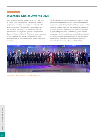 Investors%u2019 Choice Awards 2023SIAS Investors%u2019 Choice Awards (ICA) 2023 was held at Sands Expo & Convention Centre with over 600 corporates, investors and media who attended this award ceremony. We were also honoured to have Ms Grace Fu, Minister for Sustainability and the Environment of Singapore, grace our event as the Guest of Honour. A total of 75 awards were presented to companies and financial journalists who drive good governance and transparency for the benefit of investors. The Singapore Corporate Sustainability Award (SCSA) was introduced to award public listed companies that integrated sustainability into the different facets of their business models, spanning foundational processes to stringent reporting standards. This award is dedicated to spotlighting corporate sustainability practices that encapsulate both quantitative and qualitative indicators of success through an investor-centric scorecard and methodology developed in collaboration with NUS Centre for Governance & Sustainability (CGS)Winners for SIAS Investors%u2019 Choice Award 20237425TH ANNUAL REPORT | 2023 - 2024