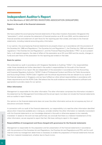 Independent Auditor%u2019s Reportto the Members of SECURITIES INVESTORS ASSOCIATION (SINGAPORE)Report on the audit of the financial statementsOpinionWe have audited the accompanying financial statements of Securities Investors Association (Singapore) (the %u201cassociation%u201d), which comprise the statement of financial position as at 30 June 2024, and the statement of financial activities and statement of cash flows for the reporting year then ended, and notes to the financial statements, including material accounting policy information.In our opinion, the accompanying financial statements are properly drawn up in accordance with the provisions of the Societies Act 1966 and Regulations (%u201cthe Societies Act and Regulations%u201d), the Charities Act 1994 and relevant regulations (%u201cthe Charities Act and Regulations%u201d), and the Financial Reporting Standards (%u201cFRS%u201d) so as to present fairly, in all material respects, the state of affairs of the association as at 30 June 2024 and the results, changes in funds and cash flows of the association for the reporting year ended on that date.Basis for opinionWe conducted our audit in accordance with Singapore Standards on Auditing (%u201cSSAs%u201d). Our responsibilities under those standards are further described in the auditor%u2019s responsibilities for the audit of the financial statements section of our report. We are independent of the association in accordance with the Accounting and Corporate Regulatory Authority (%u201cACRA%u201d) Code of Professional Conduct and Ethics for Public Accountants and Accounting Entities (%u201cACRA Code%u201d) together with the ethical requirements that are relevant to our audit of the financial statements in Singapore, and we have fulfilled our other ethical responsibilities in accordance with these requirements and the ACRA Code. We believe that the audit evidence we have obtained is sufficient and appropriate to provide a basis for our opinion.Other informationManagement is responsible for the other information. The other information comprises the information included in the statement by the Management Committee and the annual report, but does not include the financial statements and our auditor%u2019s report thereon.Our opinion on the financial statements does not cover the other information and we do not express any form of assurance conclusion thereon. In connection with our audit of the financial statements, our responsibility is to read the other information identified above when it becomes available and, in doing so, consider whether the other information is materially inconsistent with the financial statements or our knowledge obtained in the audit or otherwise appears to be materially misstated. If, based on the work we have performed, we conclude that there is a material misstatement of this other information, we are required to report that fact. We have nothing to report in this regard.Responsibilities of management and those charged with governance for the financial statementsManagement is responsible for the preparation and fair presentation of the financial statements in accordance with the provisions of the Societies Act and Regulations, the Charities Act and Regulations and FRS, and for such internal control as management determines is necessary to enable the preparation of financial statements that are free from material misstatement, whether due to fraud or error.7825TH ANNUAL REPORT | 2023 - 2024