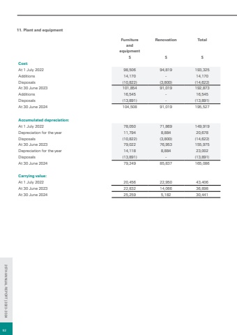 FurnitureandequipmentRenovation Total$ $ $Cost:At 1 July 2022 98,506 94,819 193,325Additions 14,170 - 14,170Disposals (10,822) (3,800) (14,622)At 30 June 2023 101,854 91,019 192,873Additions 16,545 - 16,545Disposals (13,891) - (13,891)At 30 June 2024 104,508 91,019 195,527Accumulated depreciation:At 1 July 2022 78,050 71,869 149,919Depreciation for the year 11,794 8,884 20,678Disposals (10,822) (3,800) (14,622)At 30 June 2023 79,022 76,953 155,975Depreciation for the year 14,118 8,884 23,002Disposals (13,891) - (13,891)At 30 June 2024 79,249 85,837 165,086Carrying value:At 1 July 2022 20,456 22,950 43,406At 30 June 2023 22,832 14,066 36,898At 30 June 2024 25,259 5,182 30,44111. Plant and equipment9225TH ANNUAL REPORT | 2023 - 2024