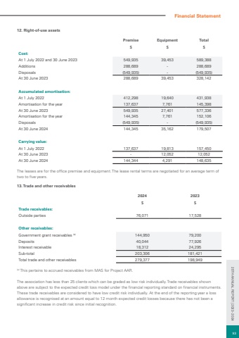 Premise Equipment Total$ $ $Cost:At 1 July 2022 and 30 June 2023 549,935 39,453 589,388Additions 288,689 - 288,689Disposals (549,935) - (549,935)At 30 June 2023 288,689 39,453 328,142Accumulated amortisation:At 1 July 2022 412,298 19,640 431,938Amortisation for the year 137,637 7,761 145,398At 30 June 2023 549,935 27,401 577,336Amortisation for the year 144,345 7,761 152,106Disposals (549,935) - (549,935)At 30 June 2024 144,345 35,162 179,507Carrying value:At 1 July 2022 137,637 19,813 157,450At 30 June 2023 - 12,052 12,052At 30 June 2024 144,344 4,291 148,63512. Right-of-use assetsThe leases are for the office premise and equipment. The lease rental terms are negotiated for an average term of two to five years.2024 2023$ $Trade receivables:Outside parties 76,071 17,528Other receivables:Government grant receivables (a) 144,950 79,200Deposits 40,044 77,926Interest receivable 18,312 24,295Sub-total 203,306 181,421Total trade and other receivables 279,377 198,94913. Trade and other receivables(a) This pertains to accrued receivables from MAS for Project AAR.The association has less than 25 clients which can be graded as low risk individually. Trade receivables shown above are subject to the expected credit loss model under the financial reporting standard on financial instruments. These trade receivables are considered to have low credit risk individually. At the end of the reporting year a loss allowance is recognised at an amount equal to 12 month expected credit losses because there has not been a significant increase in credit risk since initial recognition.Financial Statement93 25TH ANNUAL REPORT | 2023 - 2024