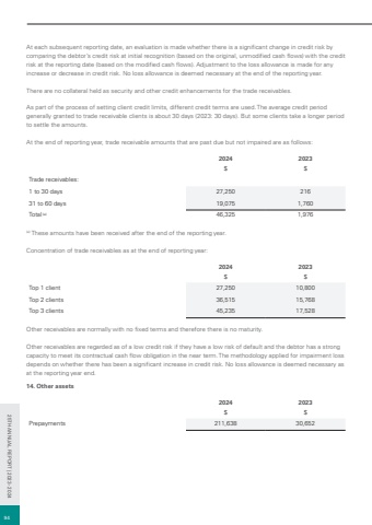At each subsequent reporting date, an evaluation is made whether there is a significant change in credit risk by comparing the debtor%u2019s credit risk at initial recognition (based on the original, unmodified cash flows) with the credit risk at the reporting date (based on the modified cash flows). Adjustment to the loss allowance is made for any increase or decrease in credit risk. No loss allowance is deemed necessary at the end of the reporting year.There are no collateral held as security and other credit enhancements for the trade receivables.As part of the process of setting client credit limits, different credit terms are used. The average credit period generally granted to trade receivable clients is about 30 days (2023: 30 days). But some clients take a longer period to settle the amounts.At the end of reporting year, trade receivable amounts that are past due but not impaired are as follows:2024 2023$ $Trade receivables:1 to 30 days 27,250 21631 to 60 days 19,075 1,760Total (a) 46,325 1,976(a) These amounts have been received after the end of the reporting year.Concentration of trade receivables as at the end of reporting year:2024 2023$ $Top 1 client 27,250 10,800Top 2 clients 36,515 15,768Top 3 clients 45,235 17,528Other receivables are normally with no fixed terms and therefore there is no maturity.Other receivables are regarded as of a low credit risk if they have a low risk of default and the debtor has a strong capacity to meet its contractual cash flow obligation in the near term. The methodology applied for impairment loss depends on whether there has been a significant increase in credit risk. No loss allowance is deemed necessary as at the reporting year end.14. Other assets2024 2023$ $Prepayments 211,638 30,6529425TH ANNUAL REPORT | 2023 - 2024