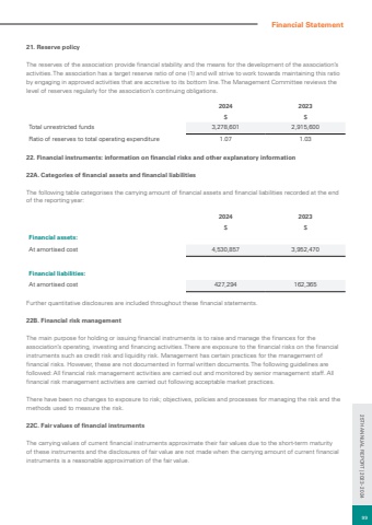 Financial Statement21. Reserve policyThe reserves of the association provide financial stability and the means for the development of the association%u2019s activities. The association has a target reserve ratio of one (1) and will strive to work towards maintaining this ratio by engaging in approved activities that are accretive to its bottom line. The Management Committee reviews the level of reserves regularly for the association%u2019s continuing obligations.2024 2023$ $Total unrestricted funds 3,278,601 2,915,600Ratio of reserves to total operating expenditure 1.07 1.0322. Financial instruments: information on financial risks and other explanatory information22A. Categories of financial assets and financial liabilitiesThe following table categorises the carrying amount of financial assets and financial liabilities recorded at the end of the reporting year:2024 2023$ $Financial assets:At amortised cost 4,530,857 3,952,470Financial liabilities:At amortised cost 427,294 162,365Further quantitative disclosures are included throughout these financial statements.22B. Financial risk managementThe main purpose for holding or issuing financial instruments is to raise and manage the finances for the association%u2019s operating, investing and financing activities. There are exposure to the financial risks on the financial instruments such as credit risk and liquidity risk. Management has certain practices for the management of financial risks. However, these are not documented in formal written documents. The following guidelines are followed: All financial risk management activities are carried out and monitored by senior management staff. All financial risk management activities are carried out following acceptable market practices.There have been no changes to exposure to risk; objectives, policies and processes for managing the risk and the methods used to measure the risk.22C. Fair values of financial instrumentsThe carrying values of current financial instruments approximate their fair values due to the short-term maturity of these instruments and the disclosures of fair value are not made when the carrying amount of current financial instruments is a reasonable approximation of the fair value.99 25TH ANNUAL REPORT | 2023 - 2024