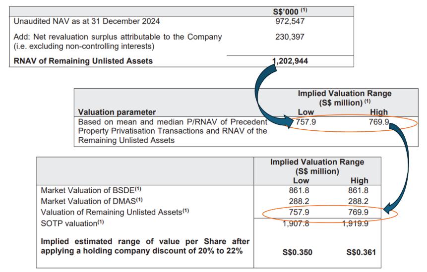 What is particularly concerning in the IFA report is that Sinarmas Land’s remaining assets, carried at $972.5 million on the balance sheet and revalued to $1.2 billion, were valued at only $757.9 million in the Sum-of-the-Parts (SOTP) analysis. The IFA applied a discount of 37% to the revalued NAV of these assets before applying a further holding company discount. In our judicial system, appeal mechanisms are a fundamental safeguard—yet in the takeover process, there appears to be no recourse for minority shareholders to challenge the IFA’s conclusions, no matter how debatable. We contend that the unlisted assets have effectively been double-discounted in the SOTP analysis. Removing the discounts could increase the fair value by as much as 10.5 cents per share.